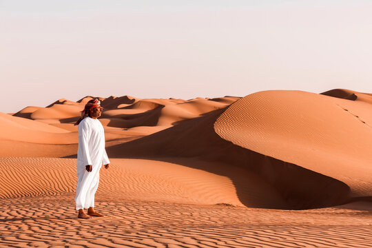 Bedouin in National dress standing in the desert, Wahiba Sands, Oman
