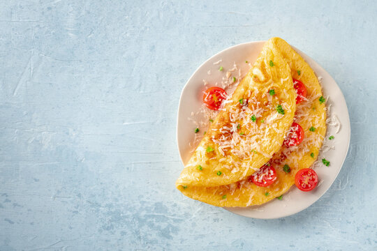 An omelet with tomato and parsley, eggs for breakfast, a healthy vegetarian dish with cheese, overhead flat lay shot with a place for text