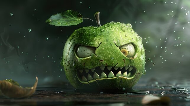 A menacing green apple with an angry face, surrounded by raindrops and fallen leaves in a misty forest setting