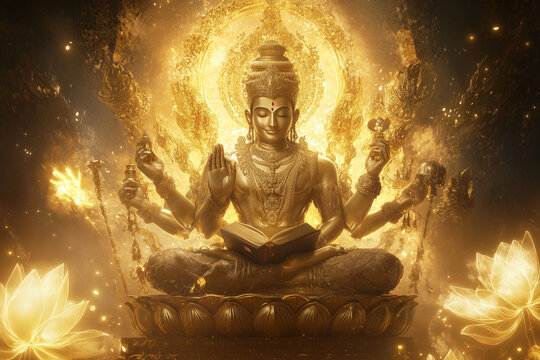 Brahma has four faces and eight arms and holds sacred objects such as books