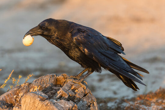 Common Raven eating an egg stolen from unguarded birds nest. Palo Alto Baylands, California.
