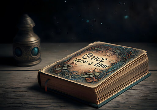 An old fairy tale book "Once upon a time" lies on an old wooden table