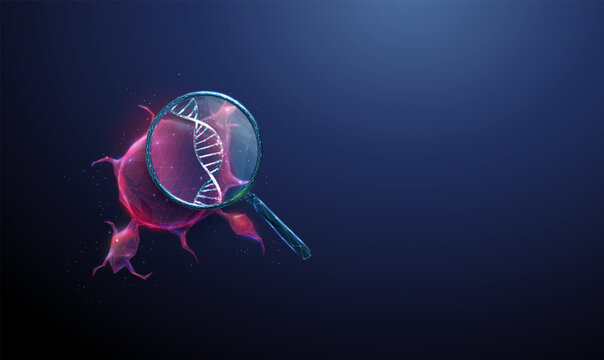 Red tumor under a magnifying glass with DNA inside. Cancer research, genetic analysis, molecular diagnostics, oncology study, precision medicine concept.