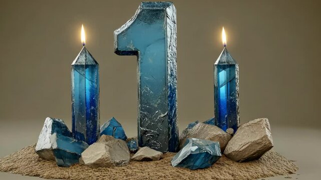 A crystal-shaped number one sits between two lit candles, surrounded by rocks and sand