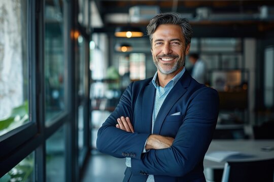 Happy middle aged business man ceo standing in office arms crossed. Smiling mature confident professional executive manager, proud lawyer, confident businessman leader wearing blue suit, Generative AI
