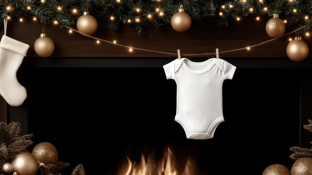 A white baby onesie is pinned to a clothesline in front of a decorated fireplace adorned with stockings and festive lights