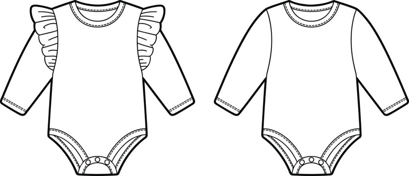 Vector baby onesie sketch, infant bodysuit flat drawing, long sleeve romper template, ruffle detail variation, fashion design illustration, garment outline