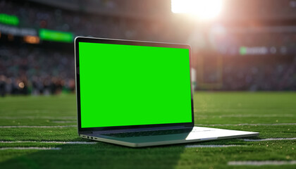 portable laptop with chroma key green screen mockup on green grass of stadium, betting and bookmakers online background, streaming and broadcasting of sport events