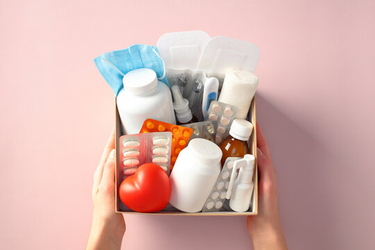 Box with essential healthcare kit with medication, pills, bandages, and face mask in female hands. Medical donations, first aid kit, home delivery of medications, online pharmacy concept.