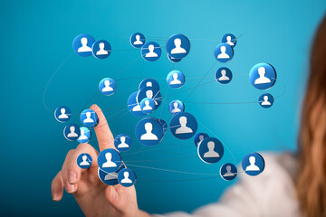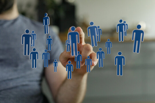 Hand interacting with digital people icons, representing social connection, networking, and online communities.