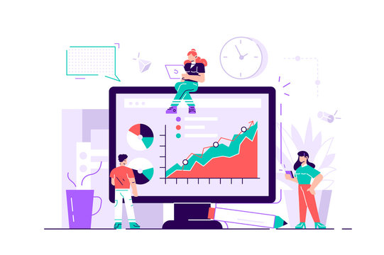 Vector modern flat illustration, concept of success, reach a goal, vector illustration of business, employees study infographics, analyze evolutionary scale, online training
