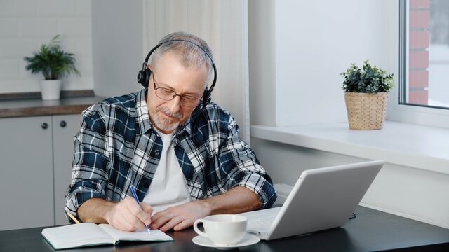 A man wearing headphones participates in online negotiations on a laptop.
