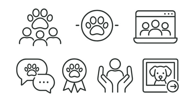Flat vector icons of pet communities and social: pet community icon, pet group chat, pet owner forum, pet meet-up, social paws, friend paw print, online profile, community badge.