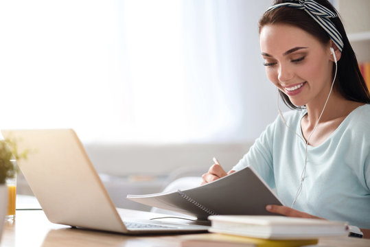 Smiling asian girl in headphones looking at laptop screen, studying at cafe