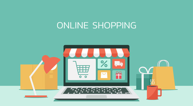 online shopping concept on laptop computer, e-shopping, and e-commerce, digital store with goods, vector flat graphic illustration