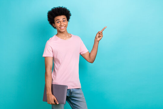 Photo of youngster junior it specialist freelancer stylish outfit direct finger empty space netbook new courses isolated on cyan color background