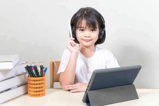 Cheerful Asian little girl student wears headphone, writes on digital tablet to study at home. Education Concept Stock Photo