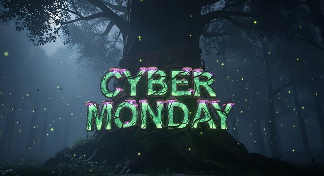 Glowing blue neon Cyber Monday text on a dark background, representing online sales, discounts, digital shopping promotions, and modern holiday marketing.