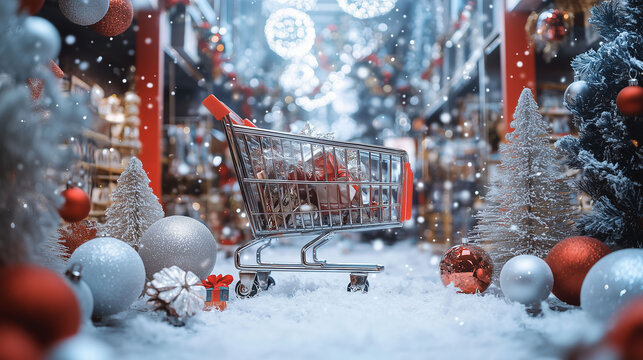 An online shopping display bursting with Christmas spirit, surrounded by festive decorations and digital shopping carts, designed to evoke joy and excitement