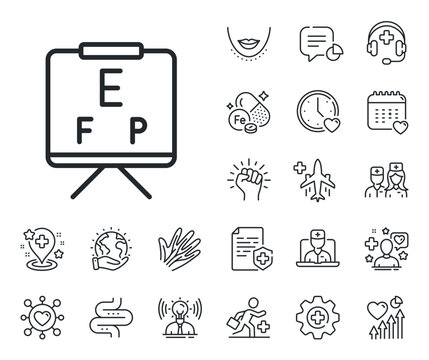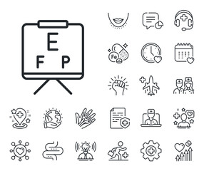 Oculist eye clinic sign. Online doctor, patient and medicine outline icons. Vision board line icon. Optometry symbol. Vision board line sign. Veins, nerves and cosmetic procedure icon. Vector