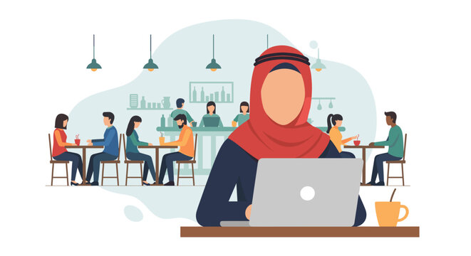 An illustration depicts a woman wearing a hijab working on a laptop in a cafe, surrounded by other people, creating a scene of modern work and social interaction.