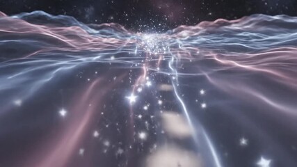 Small squirrel sits on ground, its fur shimmers with blue and orange light. Tiny sparks and glowing particles float around its fluffy tail. Mystical forest creature looks onward with bright eyes.