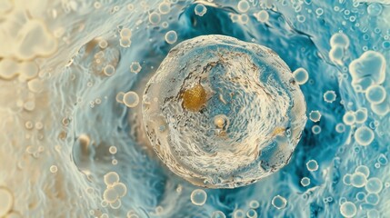 Closeup image of a human oocyte with surrounding follicular cells on white background. Concept Closeup Photography, Human Oocyte, Follicular Cells, White Background