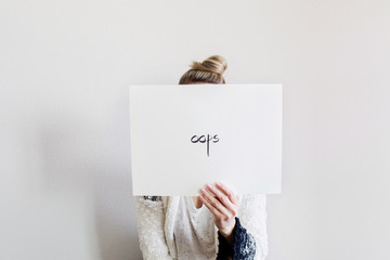 woman behind a paper with the word ""oops"" written on it
