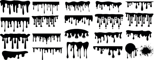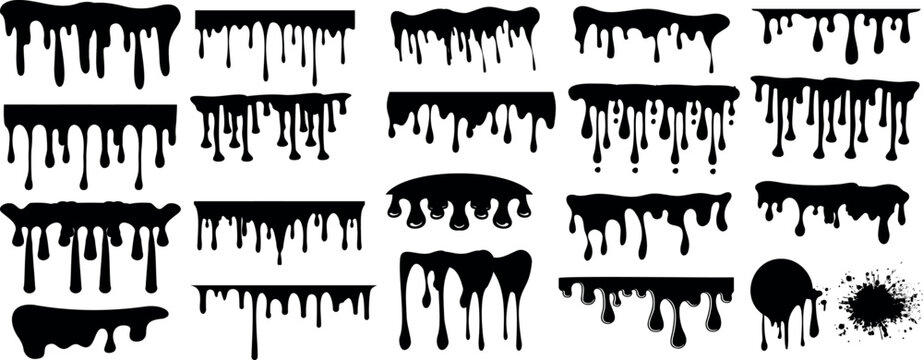 Dripping stain vector set, Black ink drips and splatters paint vector illustration on white. Perfect for abstract art, design elements, and grunge textures