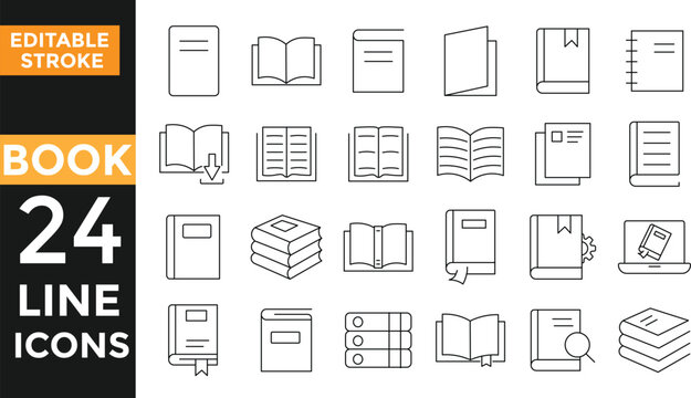 Book line icon set. Set of 24 outline icons related to the book. Library book symbol. Open and close textbook. Editable stroke.