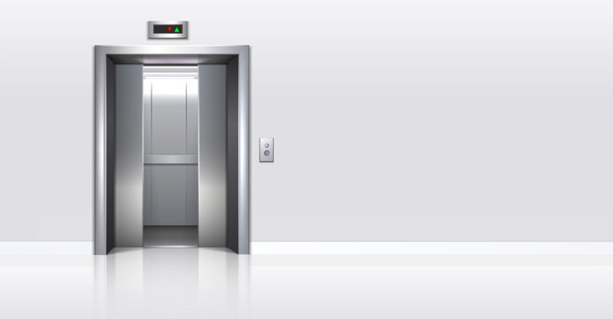 3d realistic vector illustration.  office building elevator with half closed doors and white walls corridor.