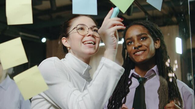 Diverse female and male businesspeople working in office with open space