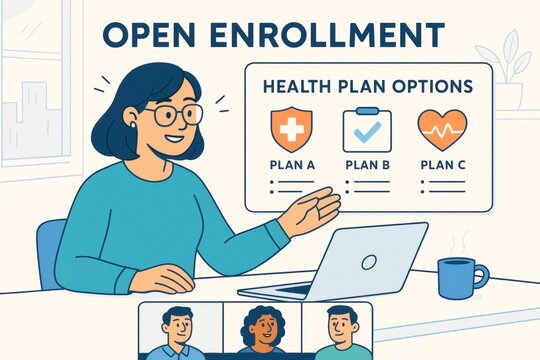 Woman explaining health plan options during open enrollment in online meeting with coworkers, creative business concept on light background. Ai generative