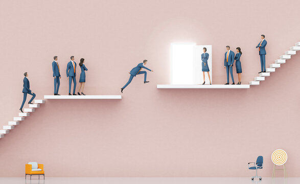 Businessman is jumping between platforms in order to achieve the higher place. Business environment concept with stairs and opened door, representing career, achievement, growth and  success 3D render
