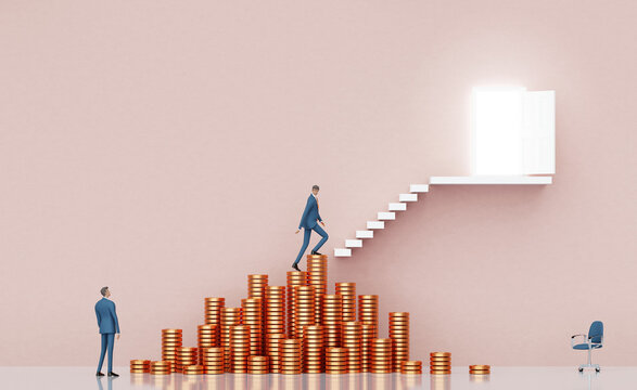 Businessman walks up using coin stacks. Business environment concept with stairs and opened door, representing career, achievement, growth and success 3D render