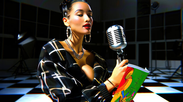 Vintage microphone is positioned center stage, bathed in the colorful glow of spotlights, creating an atmosphere of anticipation for a musical performance or open mic night