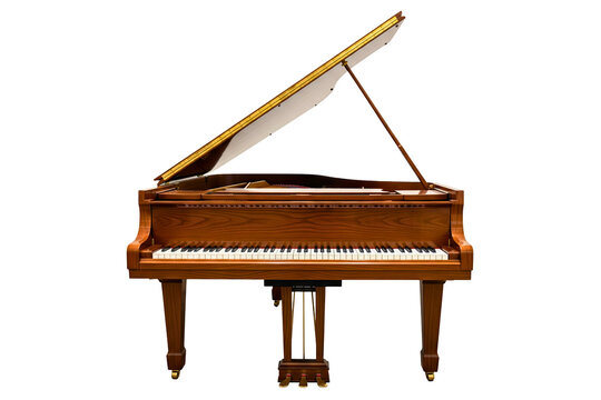 Classic wooden grand piano with an open lid front view isolated on a transparent background
