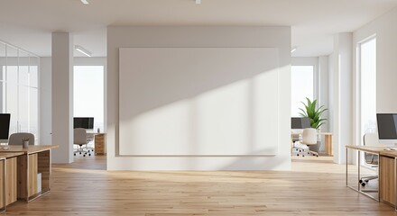 Modern open plan office space with large blank wall, light wooden floors and natural light.