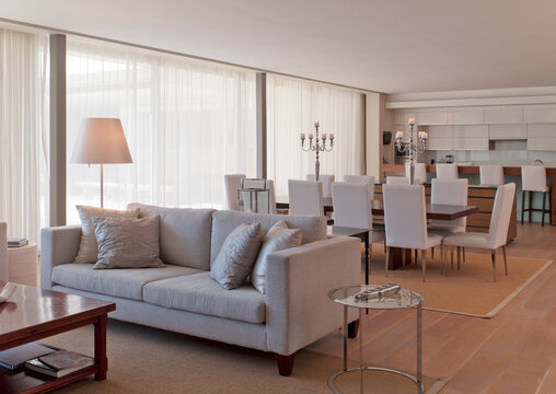 Slightly Illuminated Open Plan Living Room with the Kitchen on Elevated Floor in Daytime 3D Rendering