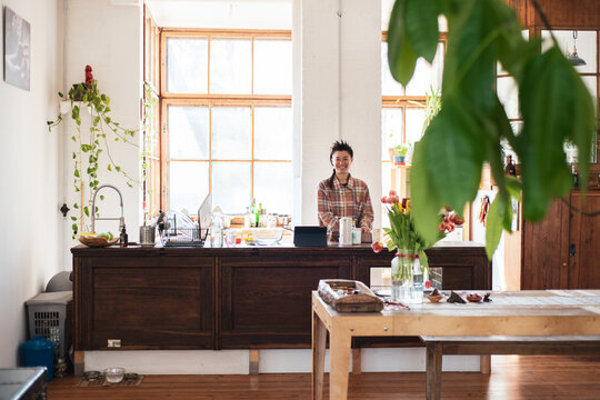 Modern apartment interior with Scandinavian design. Light, airy living area. Open plan kitchen, dining area. Light grey sofa, wooden coffee table. Modern kitchen with wooden island. Minimalist style.