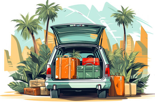 Open trunk of a car with suitcases and belongings, traveling by car to the sea or ocean coastline, illustration