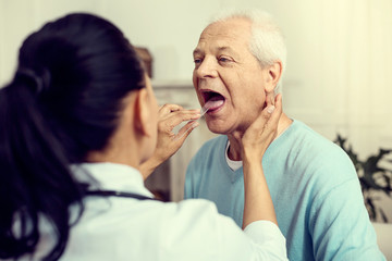 Preschool child widely open mouth showing a tongue stuck out as far as possible, with a clear view on the uvula and the soft palate. Epiglottis and the consistency of saliva are visible.