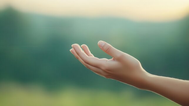 A close-up of a gentle hand reaching out, symbolizing connection and openness in a serene outdoor setting.
