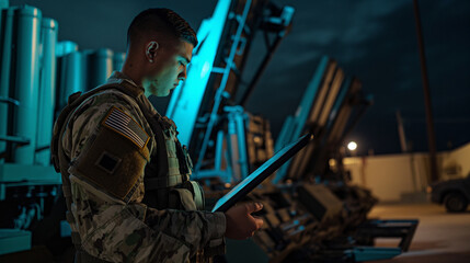 Military operative with drone in dramatic lighting.