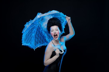 emotional actress brunette woman in an ancient medieval attire and lush hair with white feathers with a white lace umbrella in hand on a black background in the studio