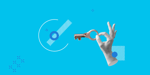 Luck, success, opportunity concept. Key in hand on blue background. Minimalist art collage