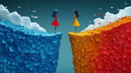 Two figures in vibrant dresses stand on contrasting cliffs, symbolizing balance between opposing forces in a surreal landscape.