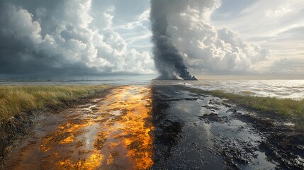 Contrasting landscapes depict environmental disaster. Burning water and golden grass oppose polluted shoreline and rising smoke. Disaster Background for impactful visuals.