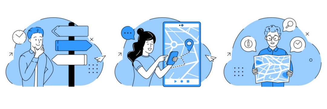 Girl using mobile phone and searching route with GPS map app. Man read map and choose which way. Effective business solution. Businessman standing road sign. Web colors. Set of 3 vector illustrations