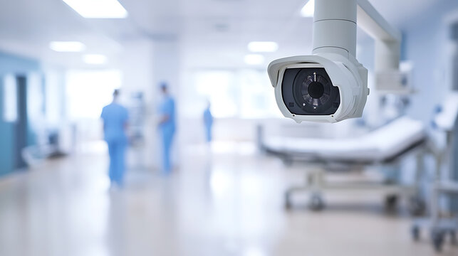 Security camera in a hospital environment with healthcare staff in the background. Ensuring patient safety and monitoring activity in medical facilities. Constant vigilance.